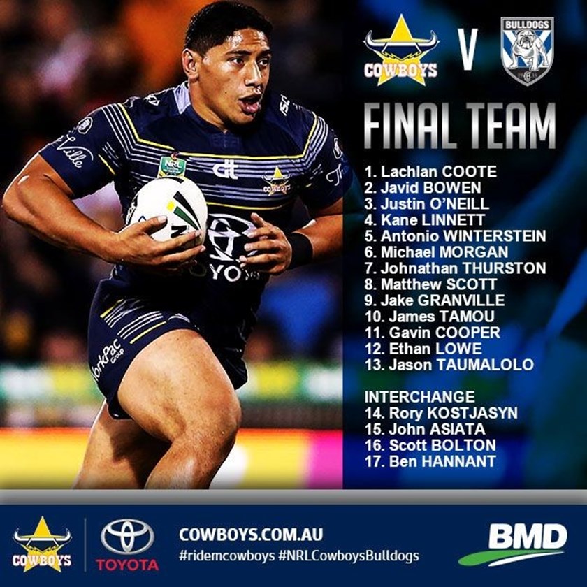 Head coach Paul Green will roll out an unchanged lineup when the North Queensland Toyota Cowboys host the Canterbury Bankstown Bulldogs in Round 20 NRL action tonight.