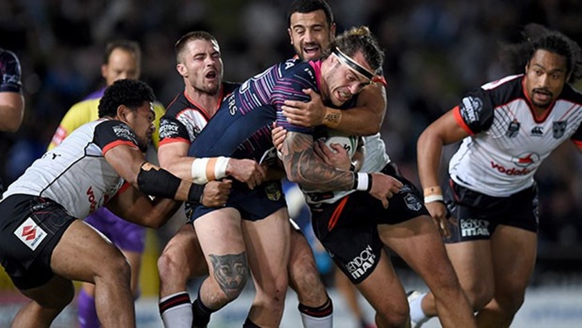 The North Queensland Cowboys have defeated the New Zealand Warriors 24-12 in a match played out in the forwards, with both teams slugging it out in the middle for the 80 minutes.