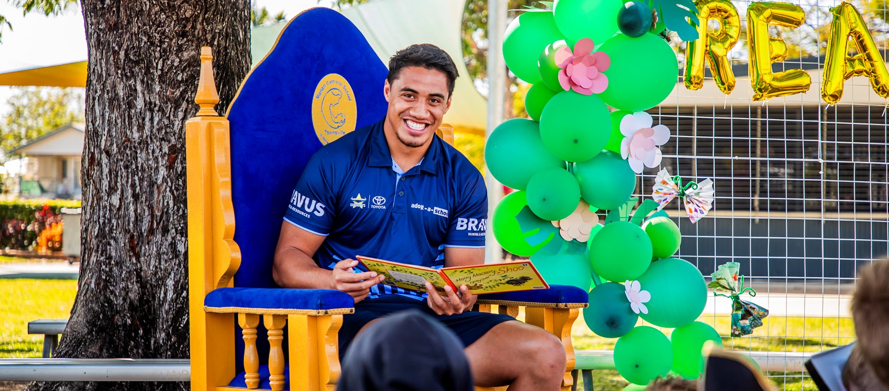 Cowboys winger Murray Taulagi helped bring this year's Book Week theme to life at Marian Catholic School, encouraging students to 'Read, Grow, Inspire' at their book week parade! Joining in the fun as part of his Adopt-a-School visit, thanks to Bravus Mining and Resources, Murray helped with the parade before sitting down and reading to students - a children's classic, Hairy Maclary!
