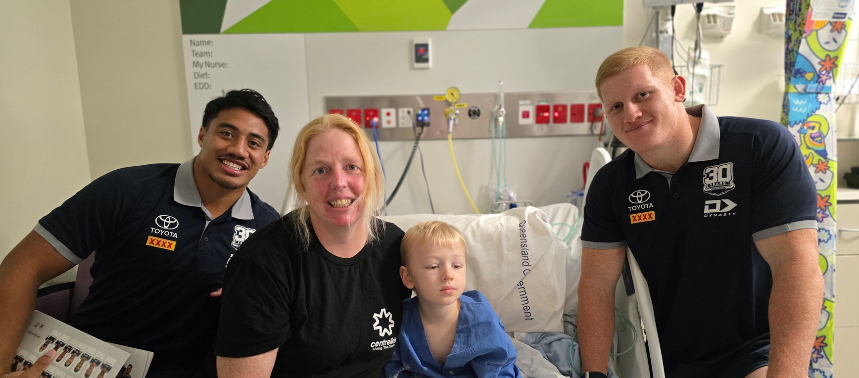 North Queensland Toyota Cowboys players Griffin Neame and Murray Taulagi received a lesson in resilience when they visited the Townsville University Hospital children’s ward and primary school earlier this week.