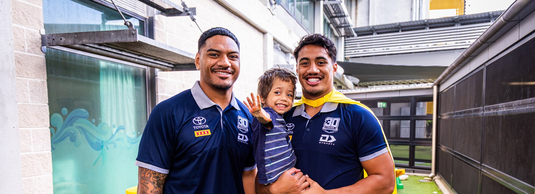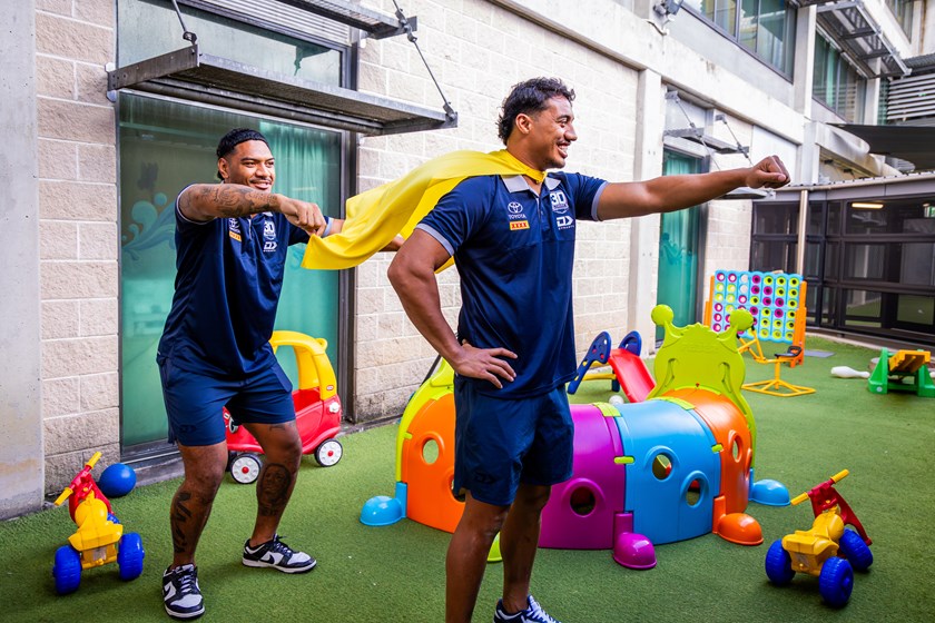 The Cowboys winger was presented with his very own yellow cape and, along with his eager sidekick Tom Mikaele, visited sick kids and their families at Townsville University Hospital yesterday.
