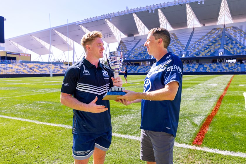 Joined by his wife, Mel, Chris watched from the sidelines of Queensland Country Bank Stadium before stepping onto the field to award this year’s honour – a surprise to Tom Dearden who received the most votes in 2025.