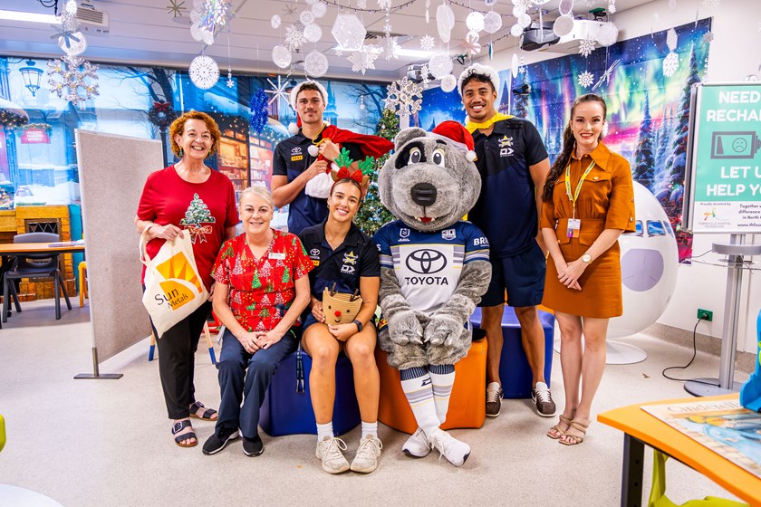 Christmas came early for patients and their families at Townsville University Hospital yesterday when Cowboys in Capes Ambassador Murray Taulagi, teammate Mason Barber and NRLW Cowboy Bree Chester brought festive cheer with an extra surprise - everyone’s favourite mascot Bluey.